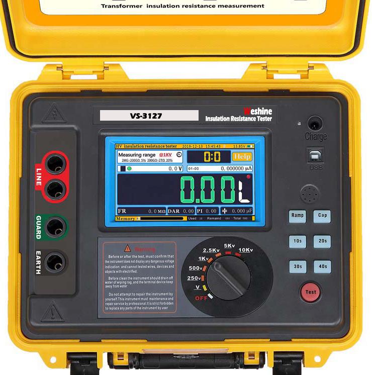 VS-3127 VS-3127மின்மாற்றியின் துருவமுனைப்பு குறியீடு30 TΩ அதிகபட்ச எதிர்ப்பைக் கொண்ட 15 kV சோதனை மின்னழுத்தம் வரை துல்லியமான காப்பு எதிர்ப்பு அளவீடுகளைச் செய்யும் திறனை வழங்குகிறது. எதிர்ப்பு அளவீட்டு துல்லியம் ± 5 % 1 MΩ முதல் 3 TΩ வரை! பயன்பாடுகள் மற்றும் சேவை நிறுவனங்களுக்கு VS-3127 ஆனது அதன் நெகிழ்வுத்தன்மை மற்றும் எதிர்காலச் சரிபார்ப்புத் திறனைக் கொண்ட ஒரு ஆல்ரவுண்ட் டெஸ்டராகும். Weshine VS-3127 நீங்கள் எங்கு வேலை செய்தாலும் வேலை செய்யும் வகையில் வடிவமைக்கப்பட்டுள்ளது. வெளியீடு மதிப்பிடப்பட்ட மின்னழுத்தம் அதிகபட்சம் 7 கியர்களை எட்டும் (250V, 500V, 1KV, 2.5KV, 5KV, 10KV, 15KV). அதிகபட்ச குறுகிய சுற்று மின்னோட்டம் 7mA காப்பு எதிர்ப்பு சோதனை (IR), துருவமுனைப்பு குறியீட்டு சோதனை(PI), மின்கடத்தா உறிஞ்சுதல் விகித சோதனை (DAR). ராம்ப் சோதனை முறை (RAMP), வடிகட்டிய எதிர்ப்பு சோதனை முறை (FR). * கொள்ளளவு சோதனை (கேப்.). மின்னழுத்த மானிட்டர் செயல்பாடு, அளவிடப்பட்ட நேரடி மின்னழுத்தத்தை தானாகவே கண்காணிக்கும்